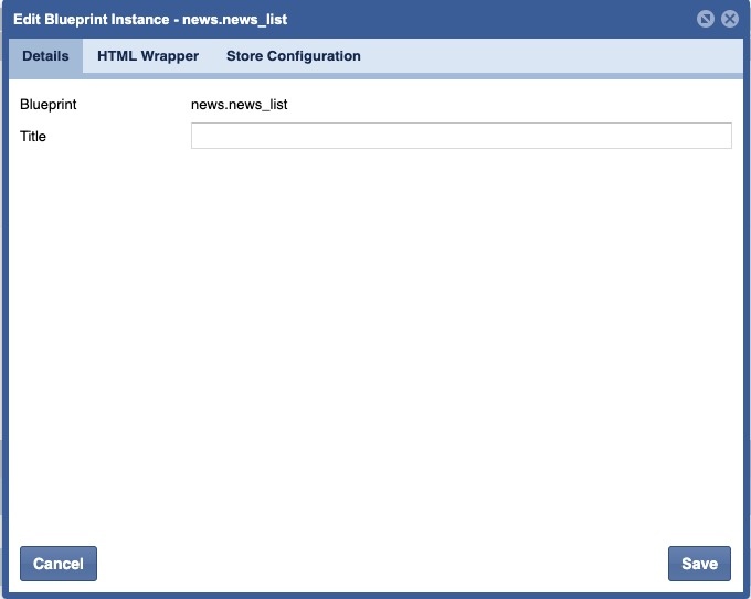 | Blueprints>Datastore Blueprint> News List | news.news_list | Presents news articles in a list view, filtered by the configuration of Group settings. |