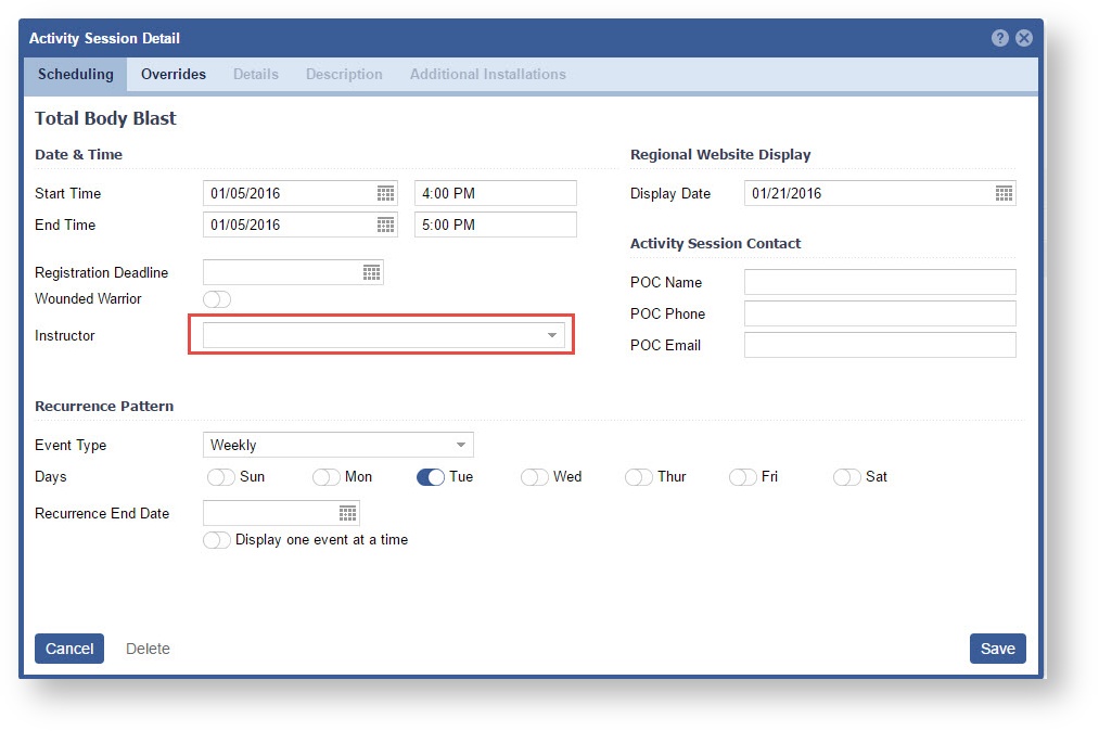 If there are no instructors to choose from you must first link valid instructors to the Activity Master record. Once linked they will display in the Activity instance. |