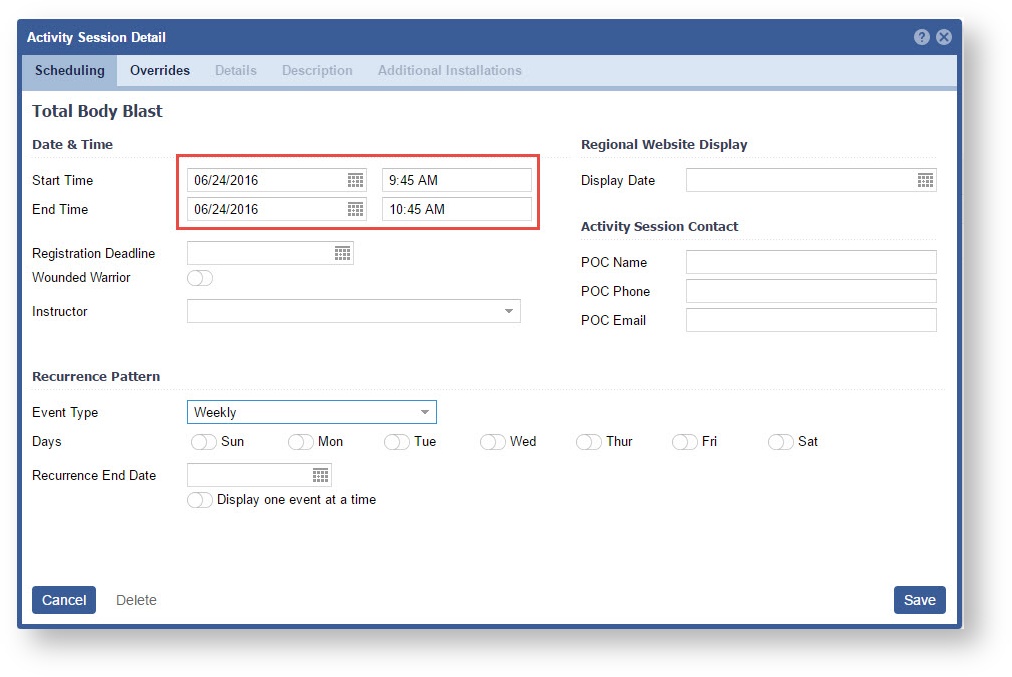 The Start and End Time are typically the same day, unless this activity occurs over multiple days. |