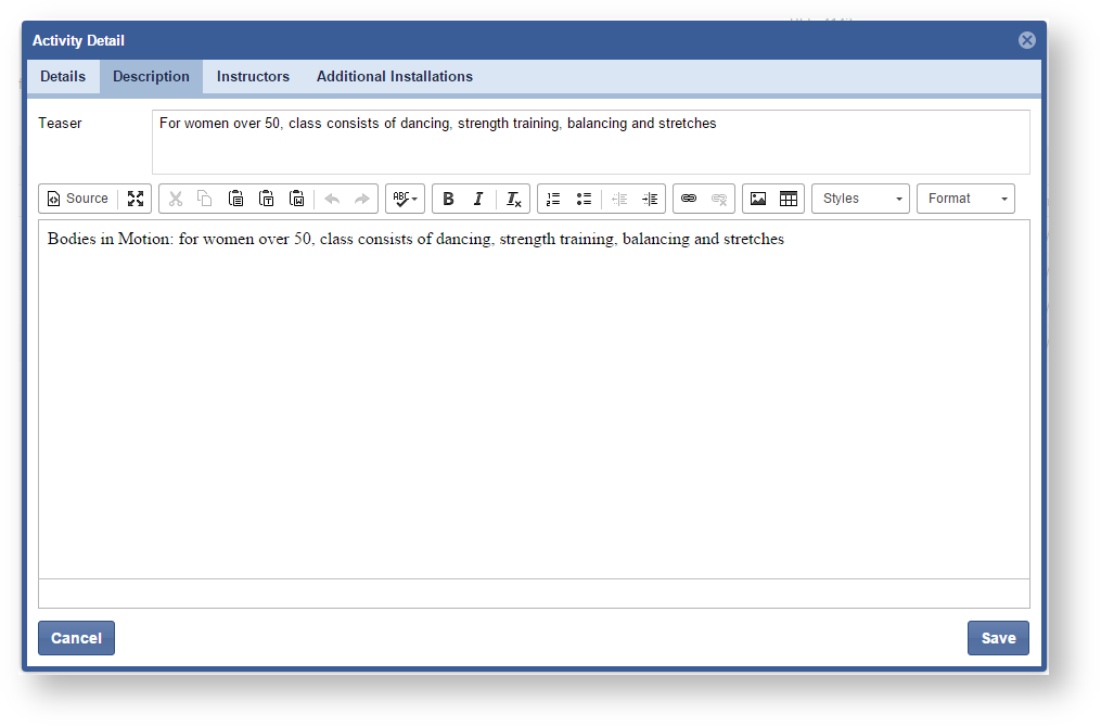 DescriptionEnter in the Description for your Activity. This will apply to all sessions so keep in mind it should not be class specific.