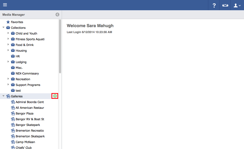 3. Hover over the Galleries folder and click the green "Plus" button.