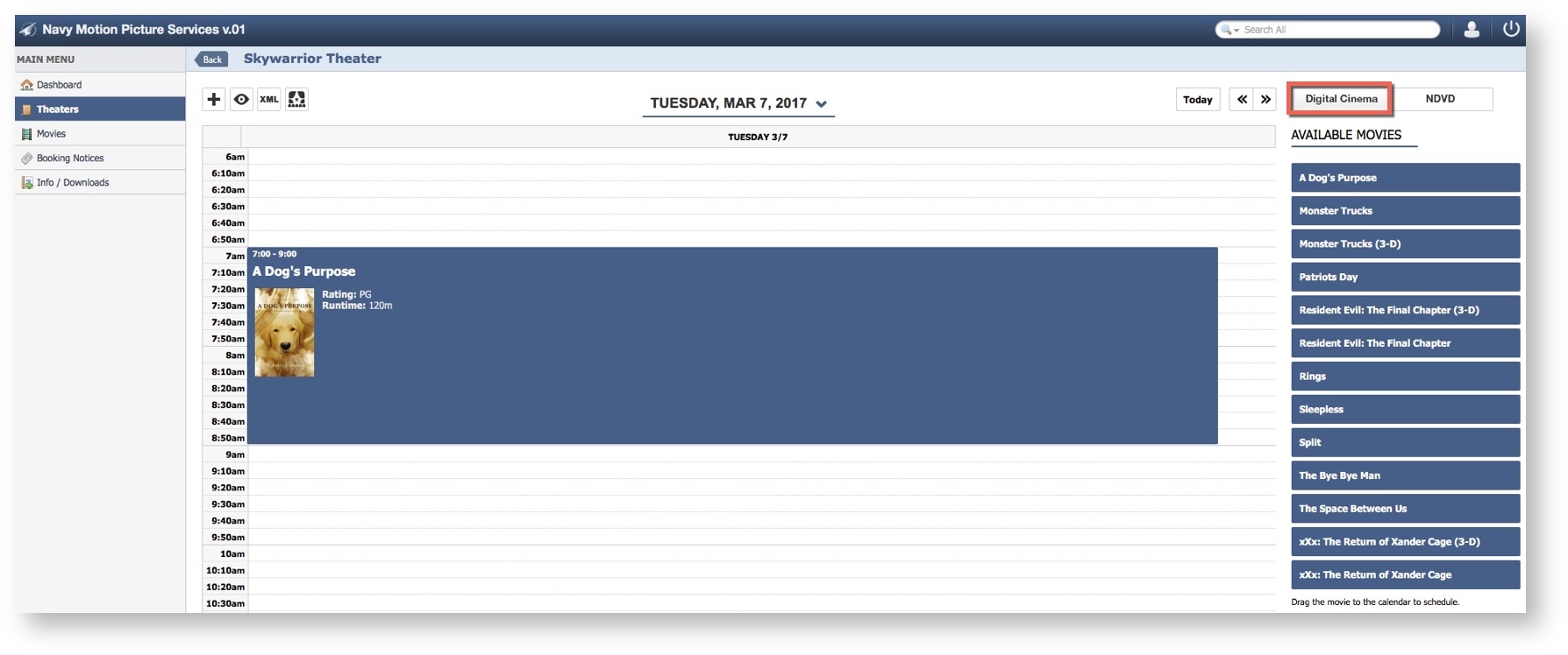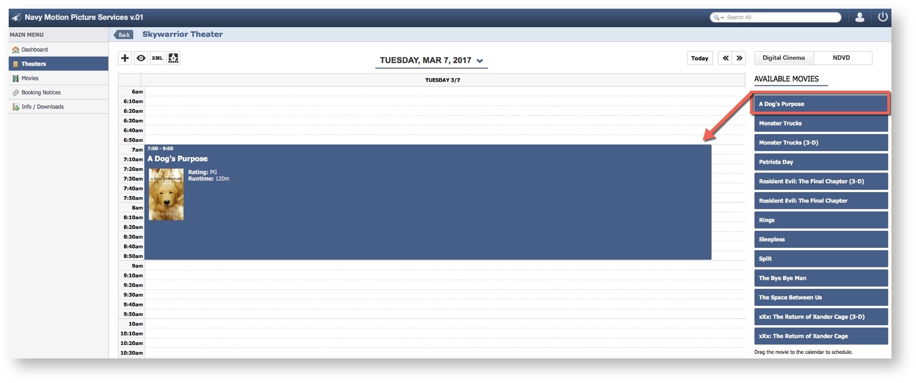 - Click an "Available Movies" Title, and Drag and Drop on the scheduled time.
