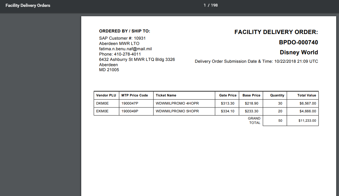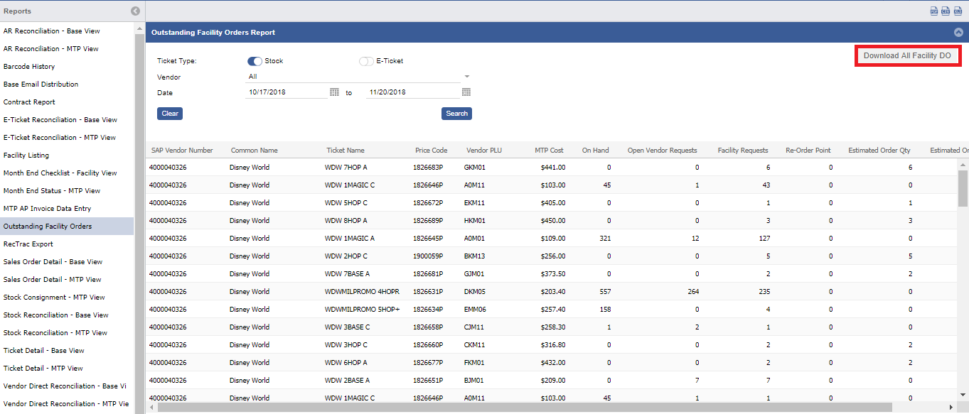Allows MTP to pull facility orders for a given date range and type of ticket.