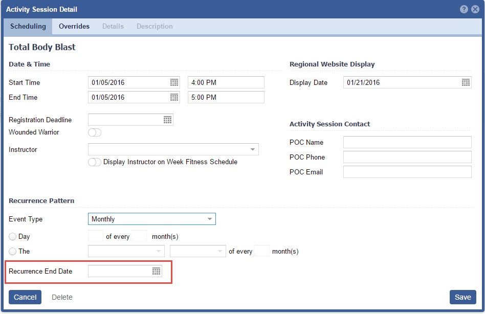 Please note that under Date & Time the Start and End Time share the same date. This information is just for the first occurrence. You will set the recurrence End date in the "Recurrence End Date" field.
