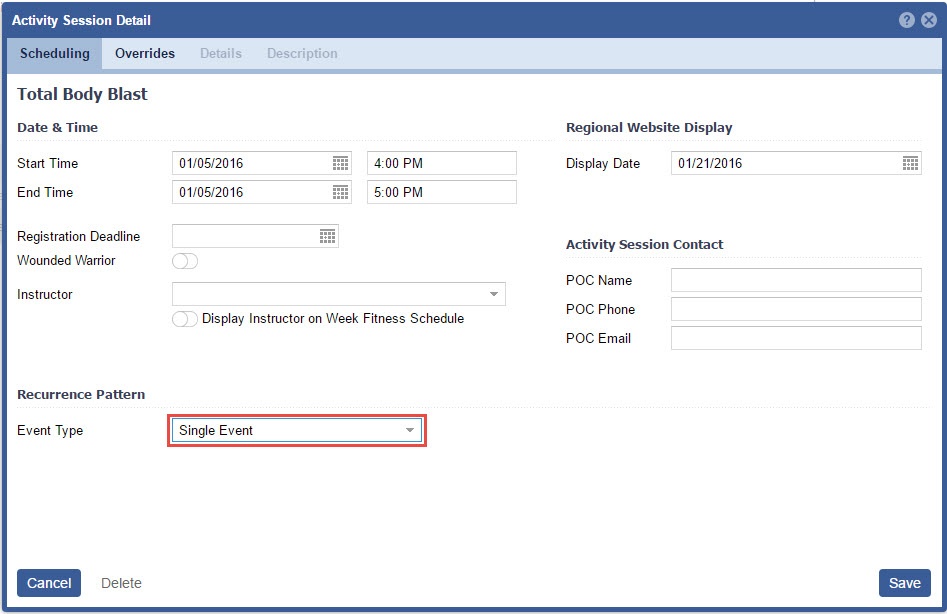 - If there are no instructors to choose from, you must first link valid instructors to the Activity Master record. Once linked, they will display in the Activity instance.