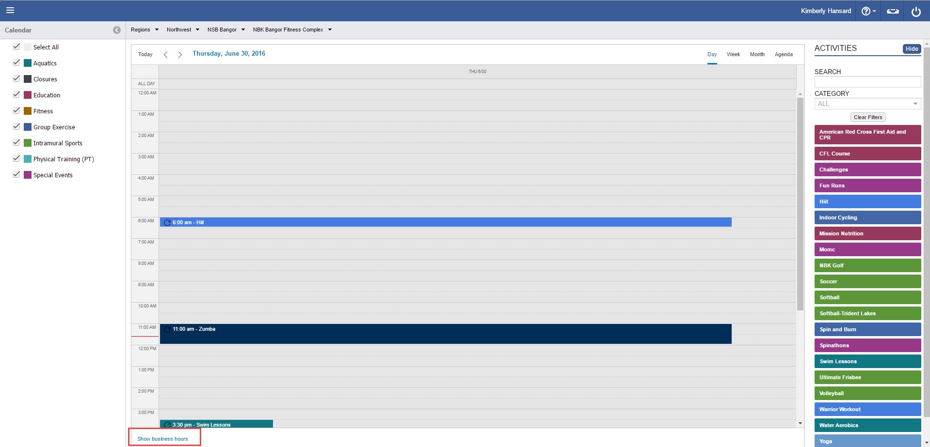 The Day view displays Activities for the selected day. Adding or removing Filters and Breadcrumbs will update the view appropriately.