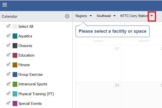 - Select the appropriate Facility or Space from the filter for the calendar to display.