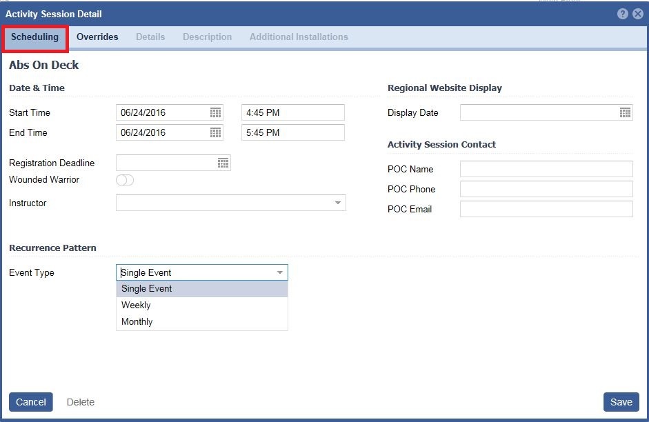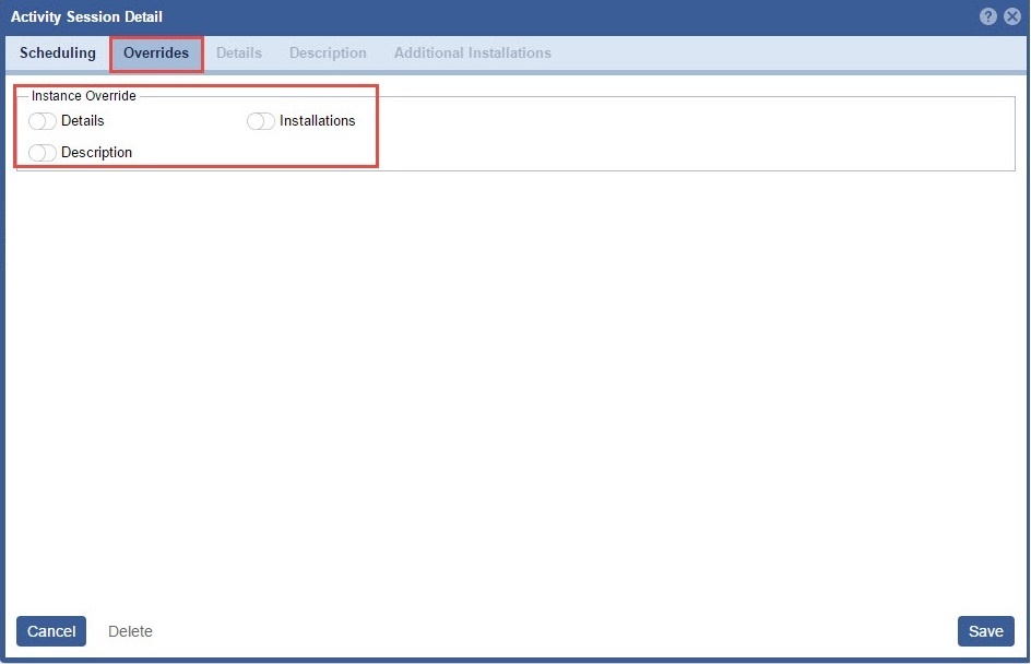 6. Click on the Overrides tab if any information is different for this particular session than what is being inherited by the Activity. The information can be changed by turning on the additional tabs.