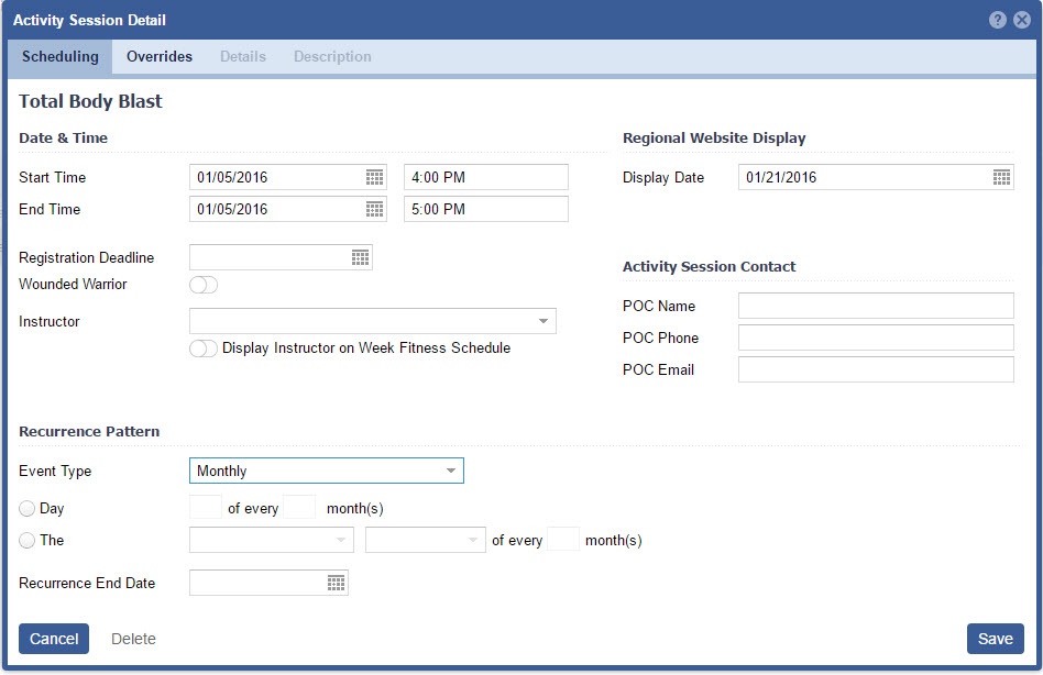 | Display Date | Enter in the date you wish for the session to display on the regional MWR marketing website. | |