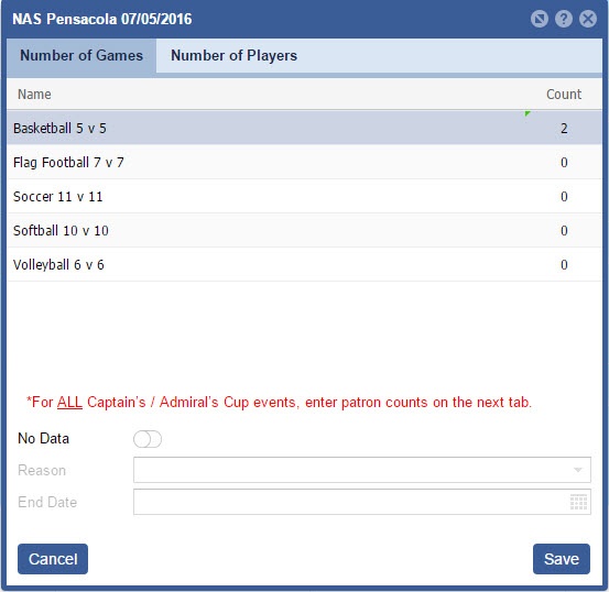 6. Update the tabs as needed or toggle "No Data" ON and enter a reason if nothing occurred that day. If you select "No Data" the Number of Players tab will gray out as well. Click the "Save" button when complete.