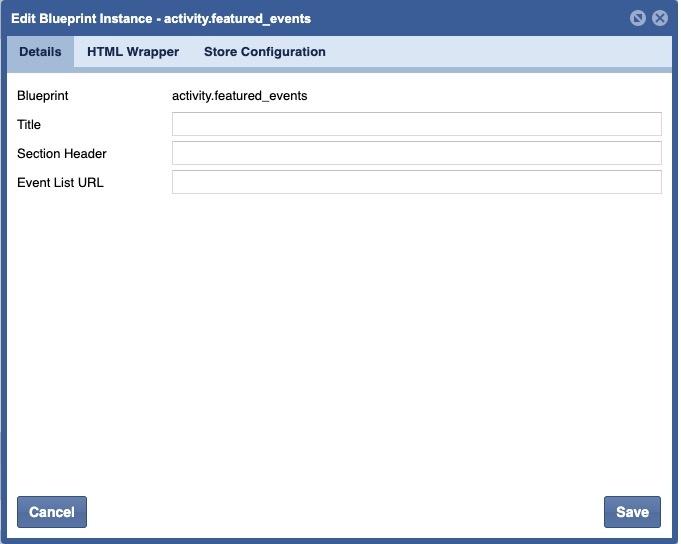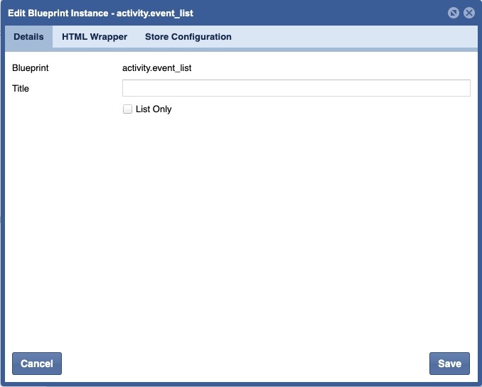 Blueprints>Datastore Blueprint> Activity Listactivity.event_listDisplays all events associated to the Groups and Activity Categories and Sub-Categories selected.