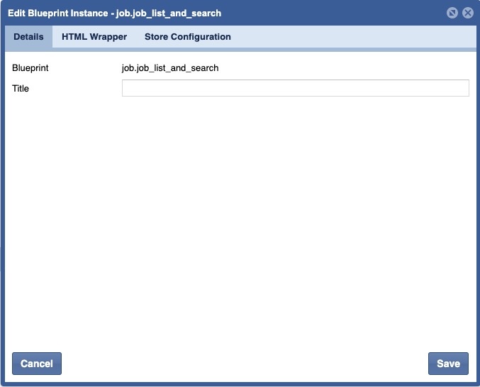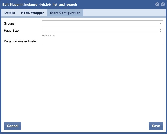 Blueprints>Datastore Blueprint> Job Listjob.job_list_and_searchPresents jobs in a list view, filtered by the configuration Group settings. The job listing view is accompanied by a search feature.