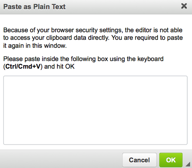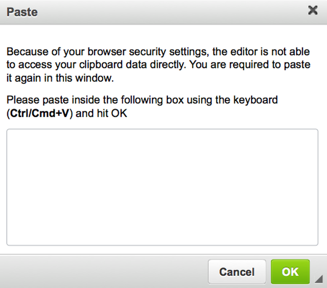 If direct access to clipboard is blocked, you will be asked to paste the text into the Paste dialog window using the Ctrl+V keyboard shortcut.