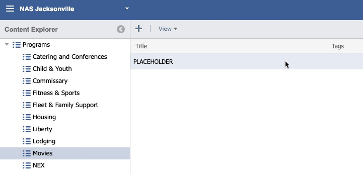 The Content Explorer console contains records that are organized by “Type”. For example a Program is a “Type” of record. Upon entering, the content types are listed in the left panel. Clicking on a content type will display a list of all records in the main content panel (right side).