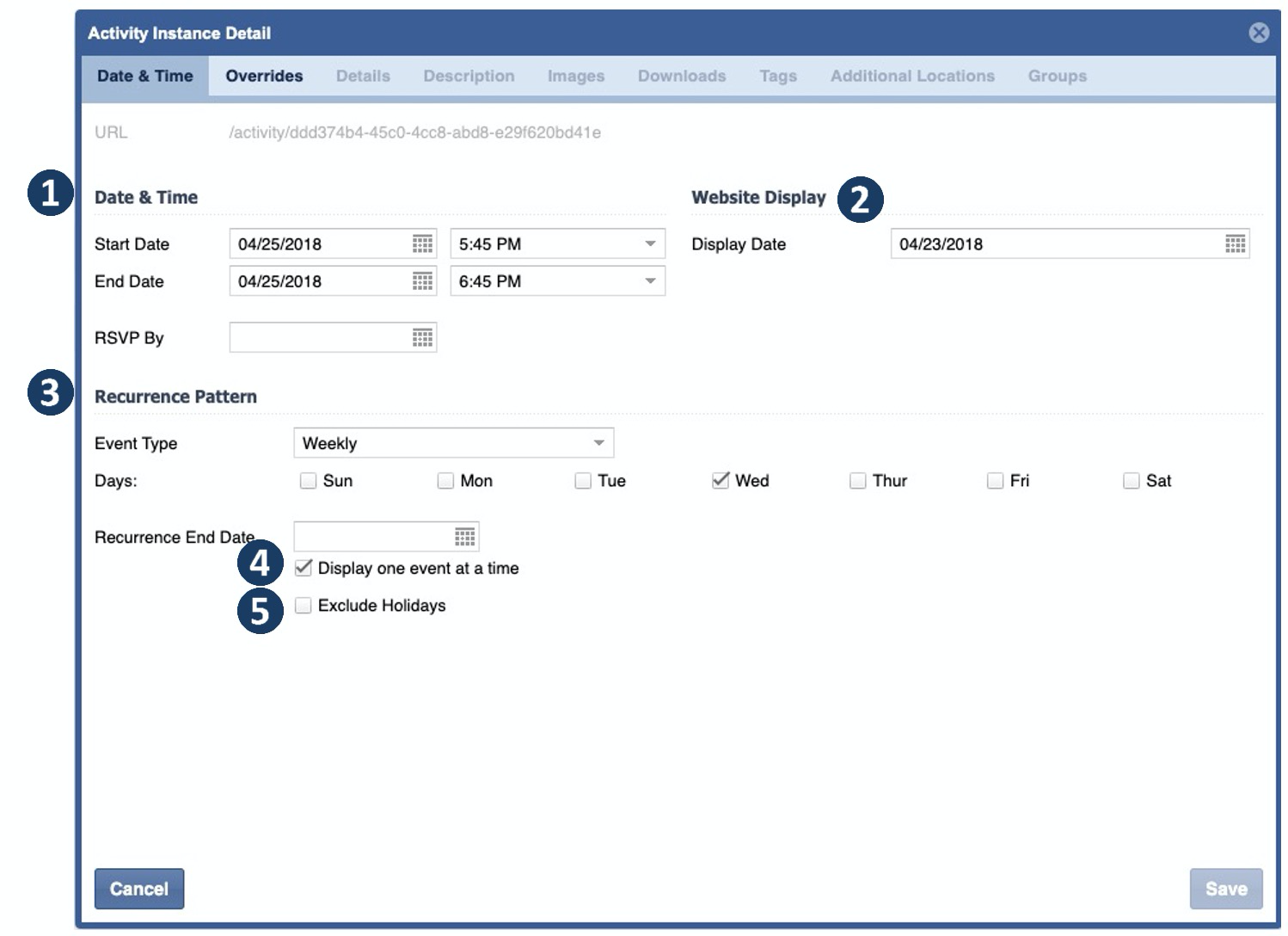 | 2 | Website Display - Set the date this event will display on web and mobile page(s). |