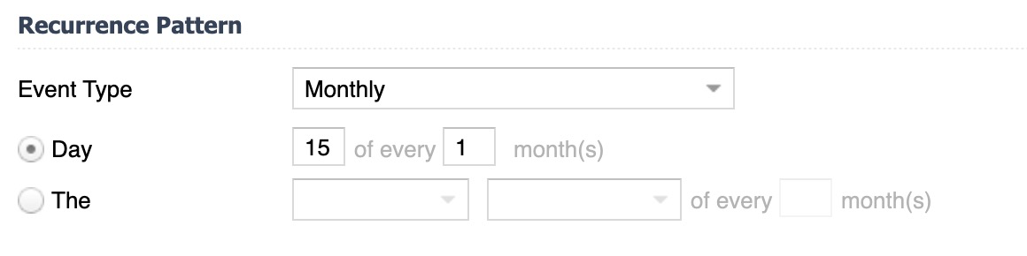 Monthly | If chosen, monthly recurrence dates can be established by two different structures. By setting the Day of the Month and Month(s) of recurrence OR by custom drop downs. |