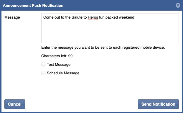 "Schedule Message" populates a Date and Time field for delayed notification deployment.