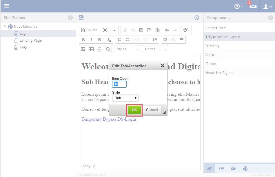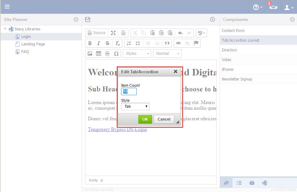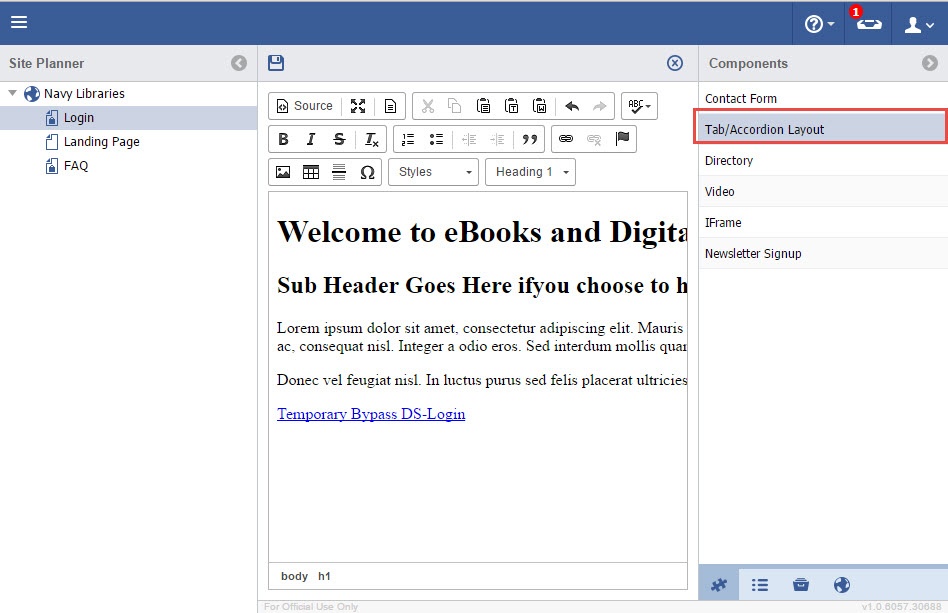 2. In the Components Tab of the right sidebar, double click on Tab/Accordion Layout.
