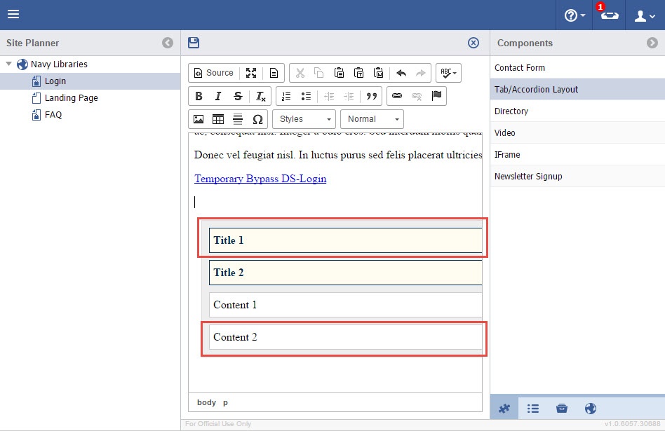 5. The Tab List is created with Title Area and Content Areas for each corresponding Item.