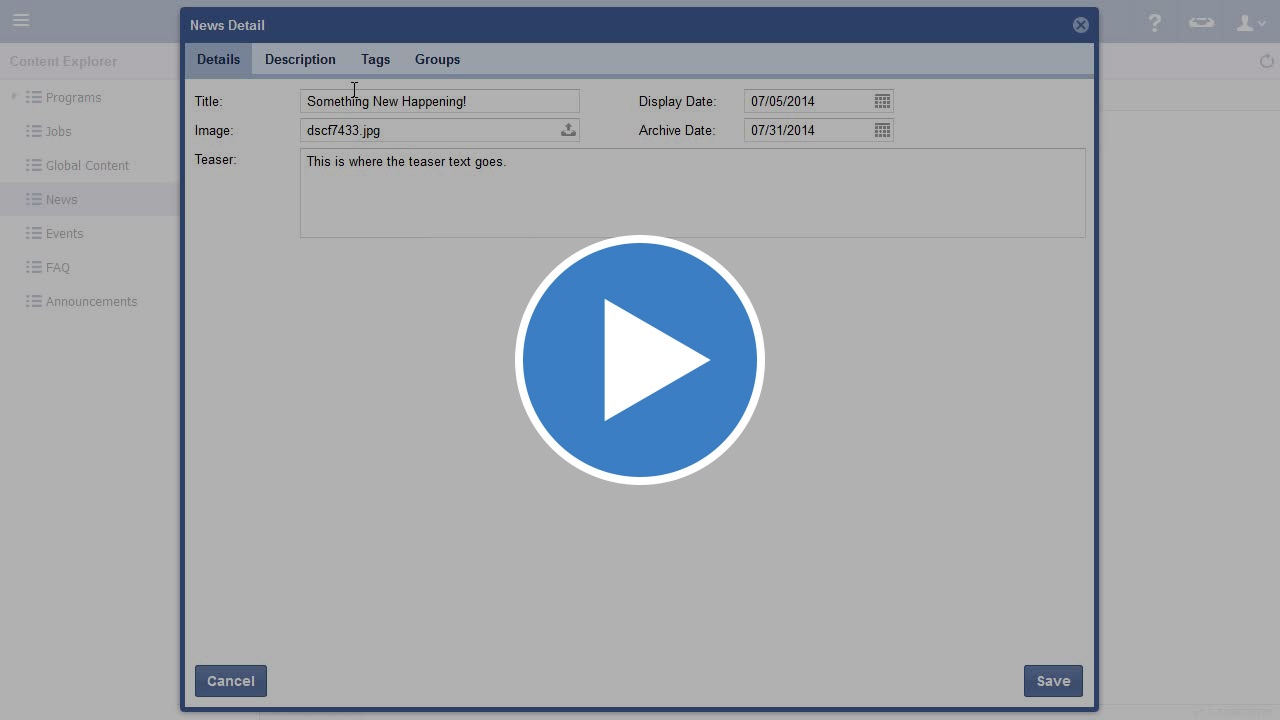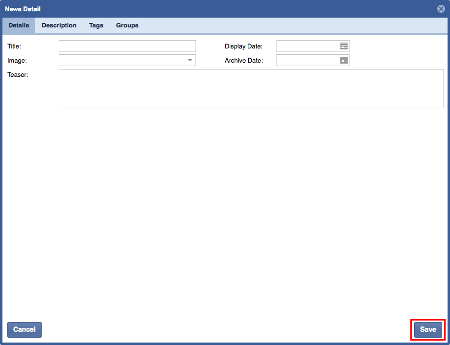 6. Continue adding additional information by clicking on other tabs (Such as, Description, Tags, and Groups).
