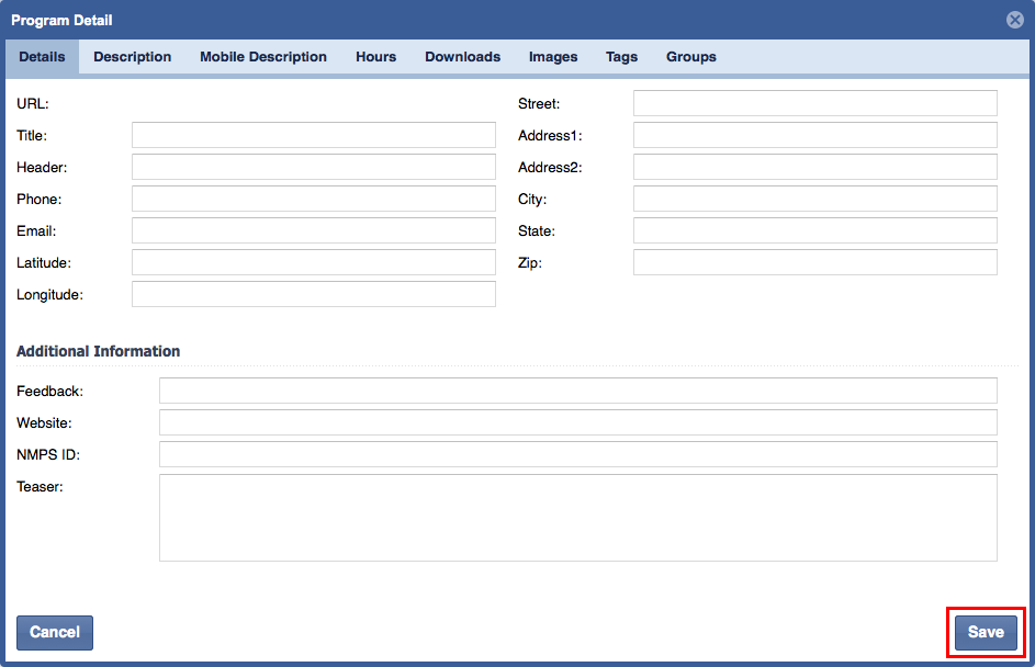 7. Continue adding additional information by clicking on other tabs (Such as, Description, Mobile Description, Hours, Downloads, Images, Tags, and Groups).