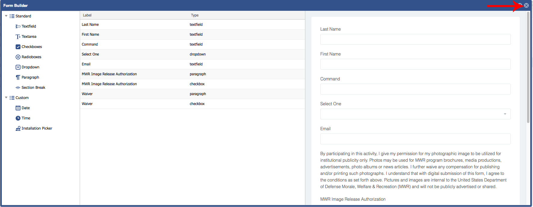 - Once the form is complete it will save when the x in the top right corner of the form window is clicked.